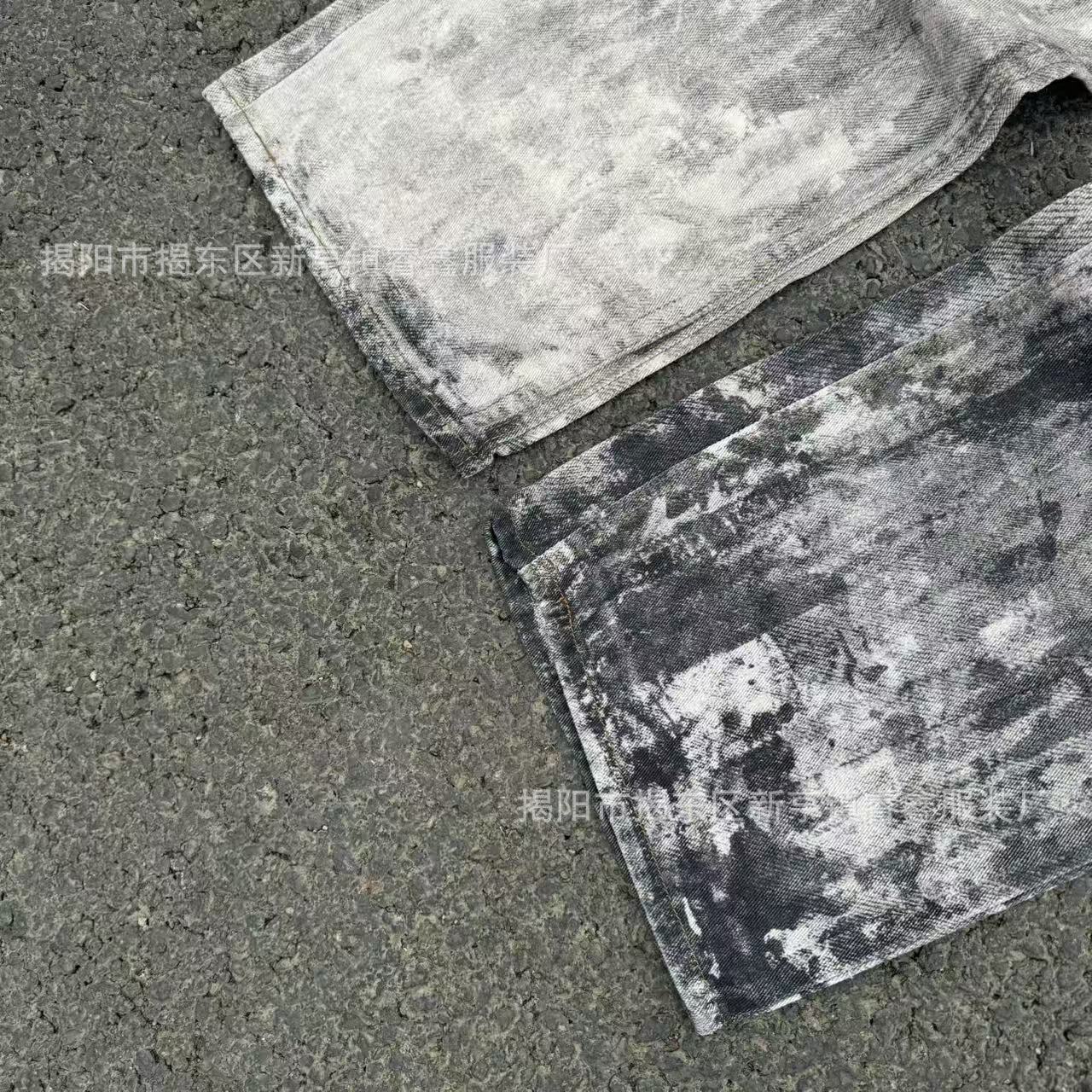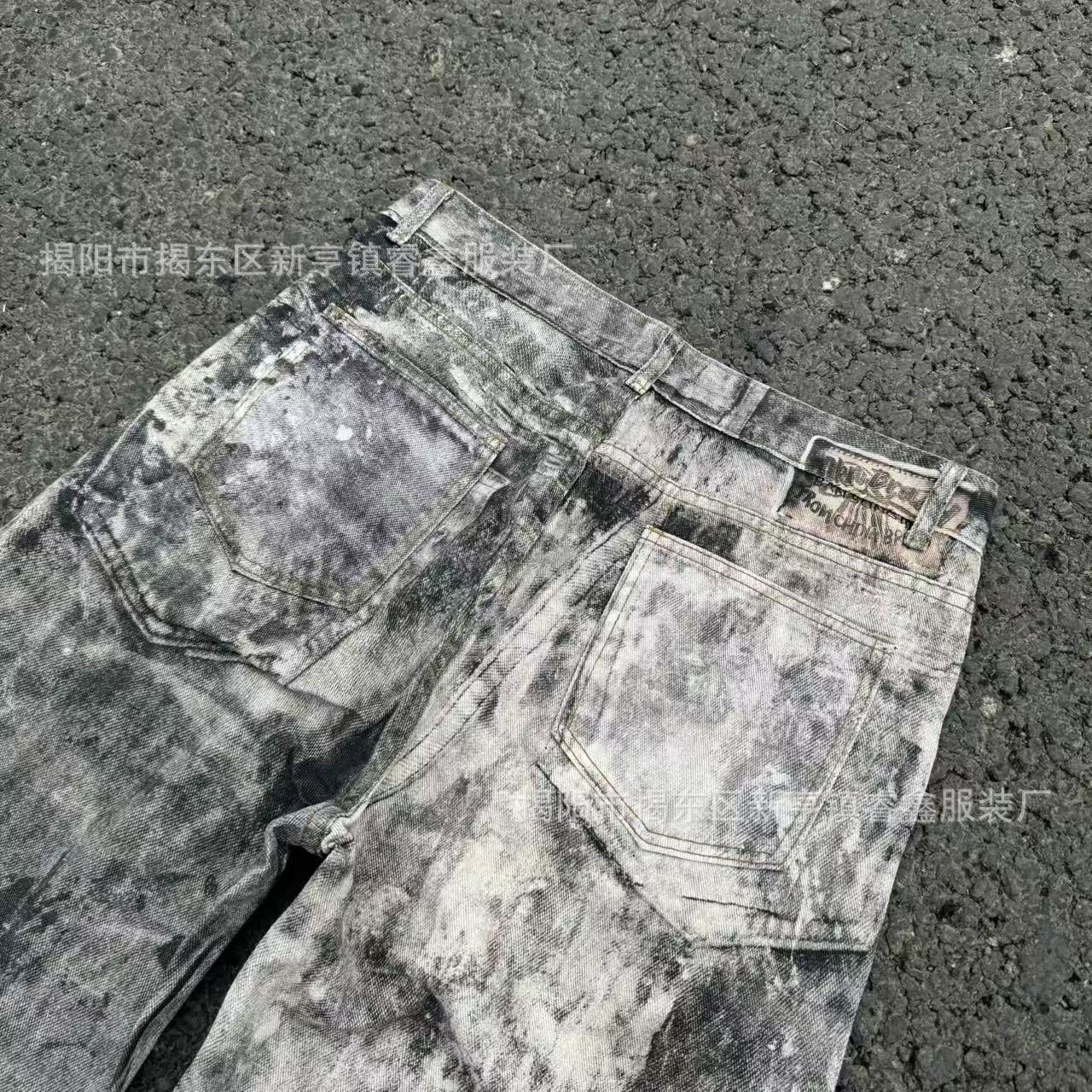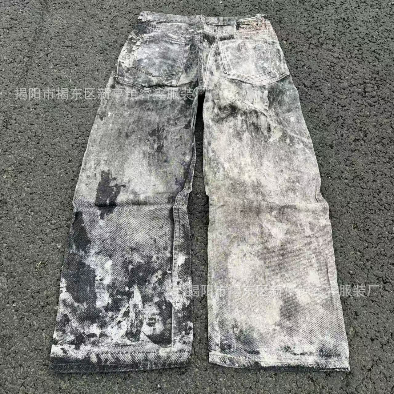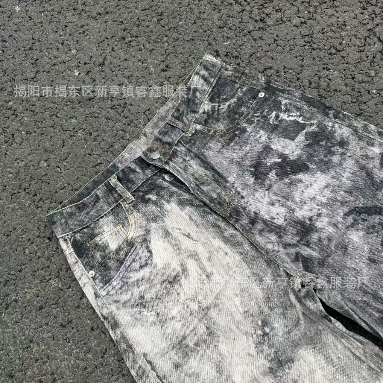 美式复古3D数码印泼墨做旧牛仔裤男女高街cleanfit宽松直筒休闲裤