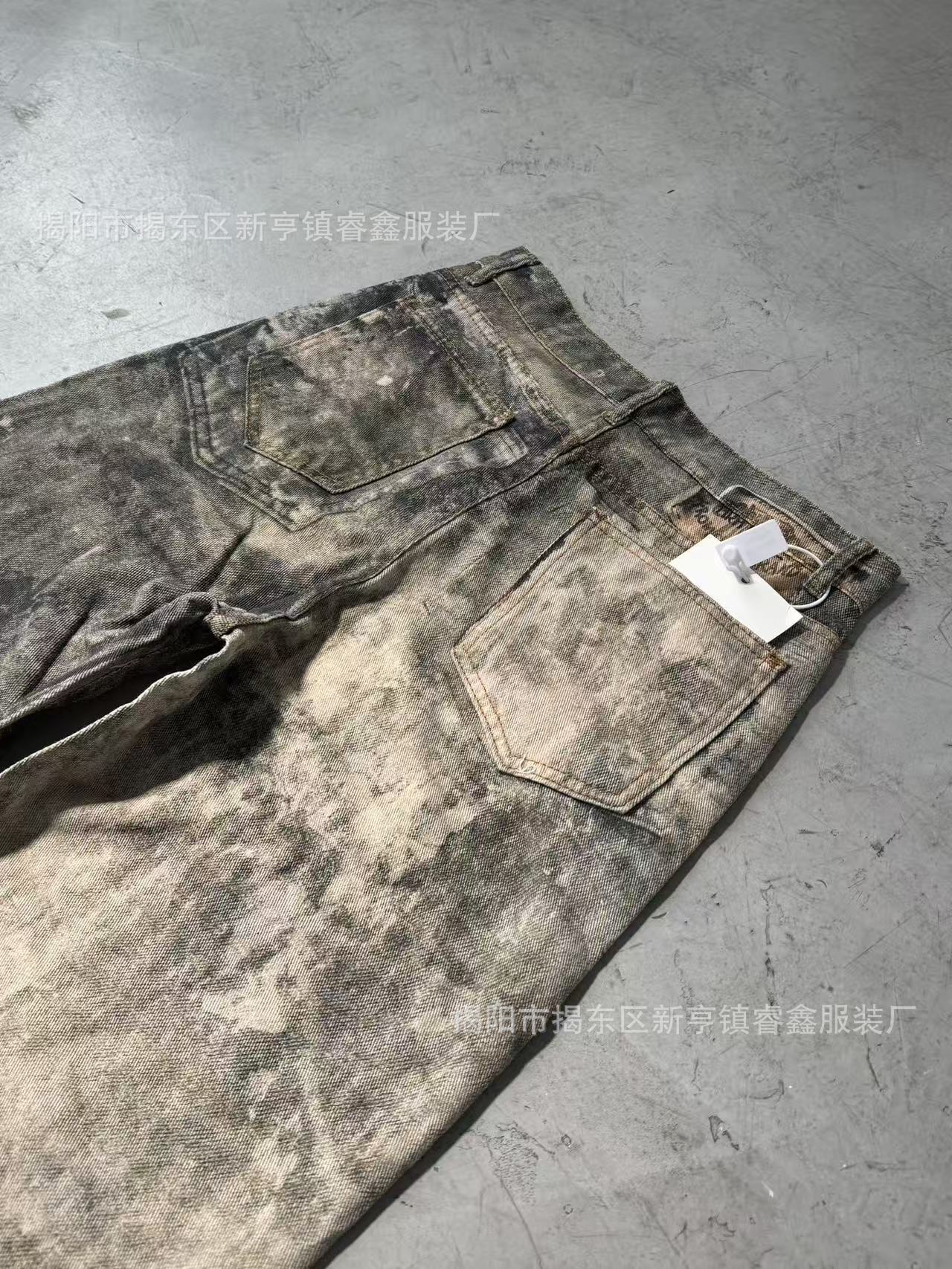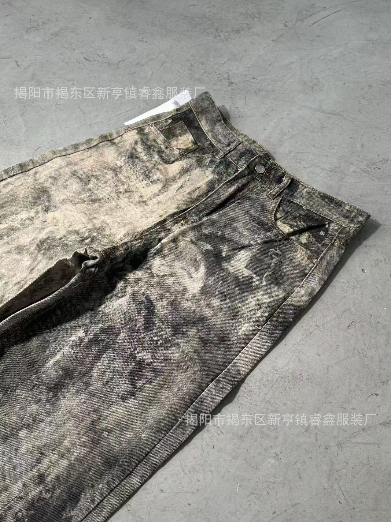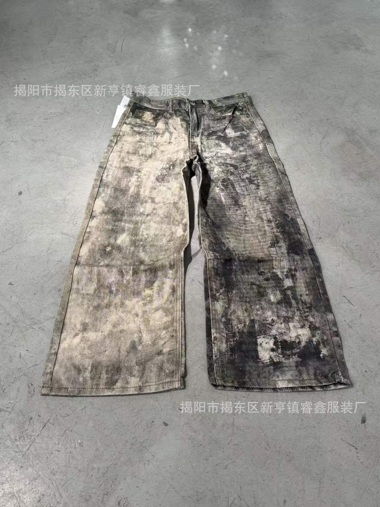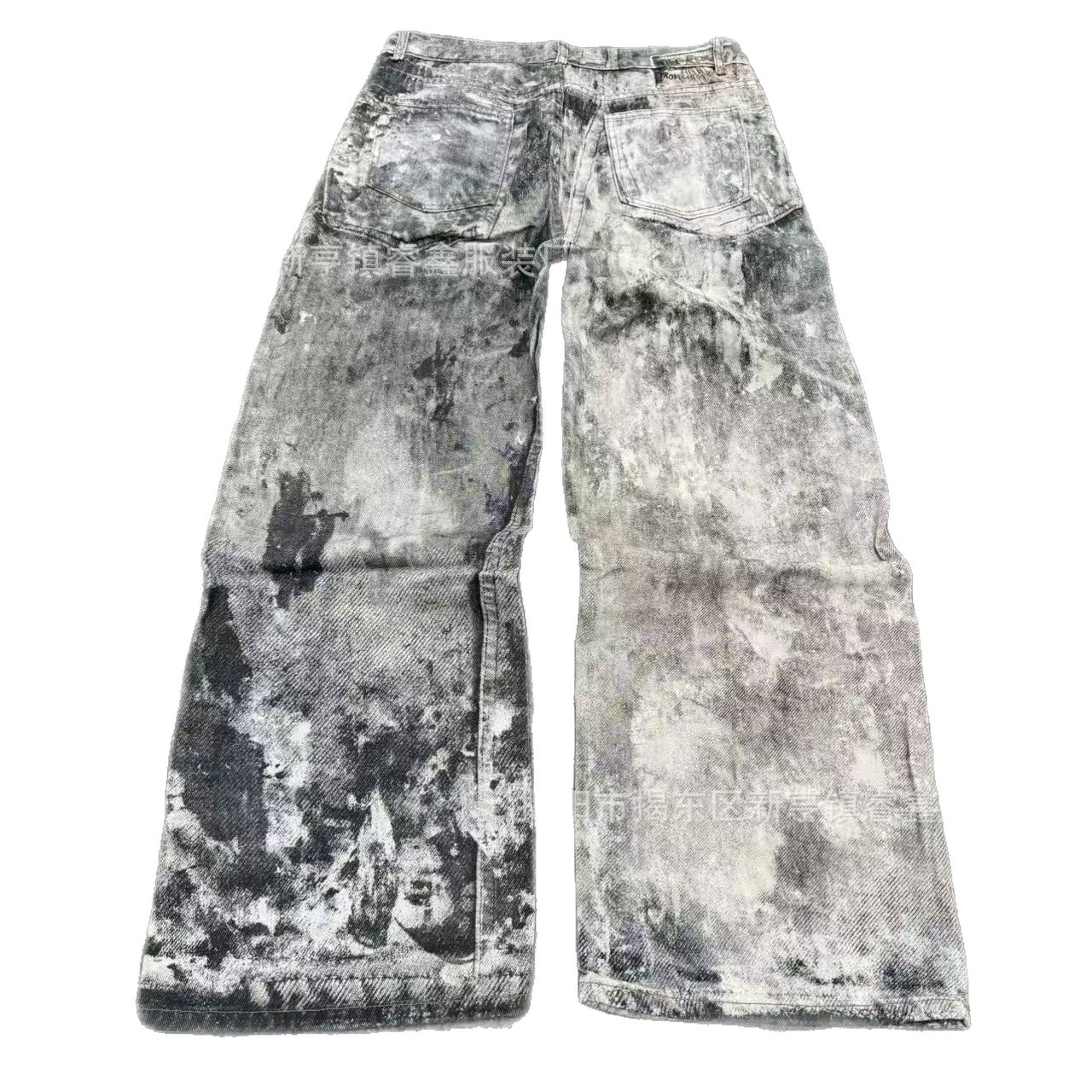美式复古3D数码印泼墨做旧牛仔裤男女高街cleanfit宽松直筒休闲裤